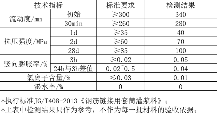 后期膨胀:在密闭条件下的后期膨胀(硬化后膨胀),保证钢筋与套筒连接牢固;